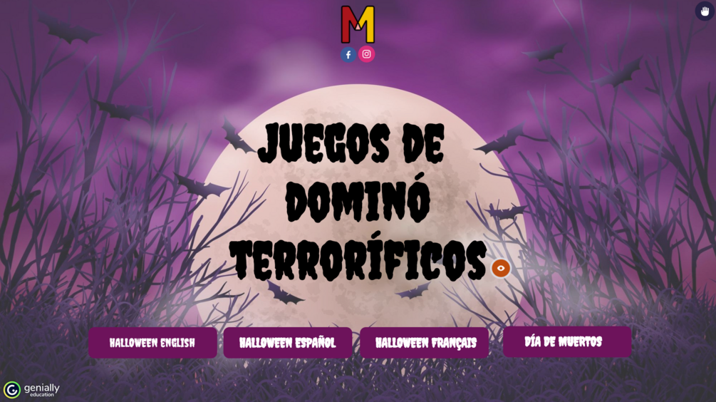 Dominó de Halloween en español, francés y inglés. Día de Muertos en español. Se puede usar en modo libre, dos y cuatro jugadores.