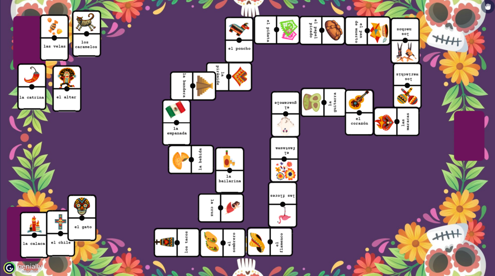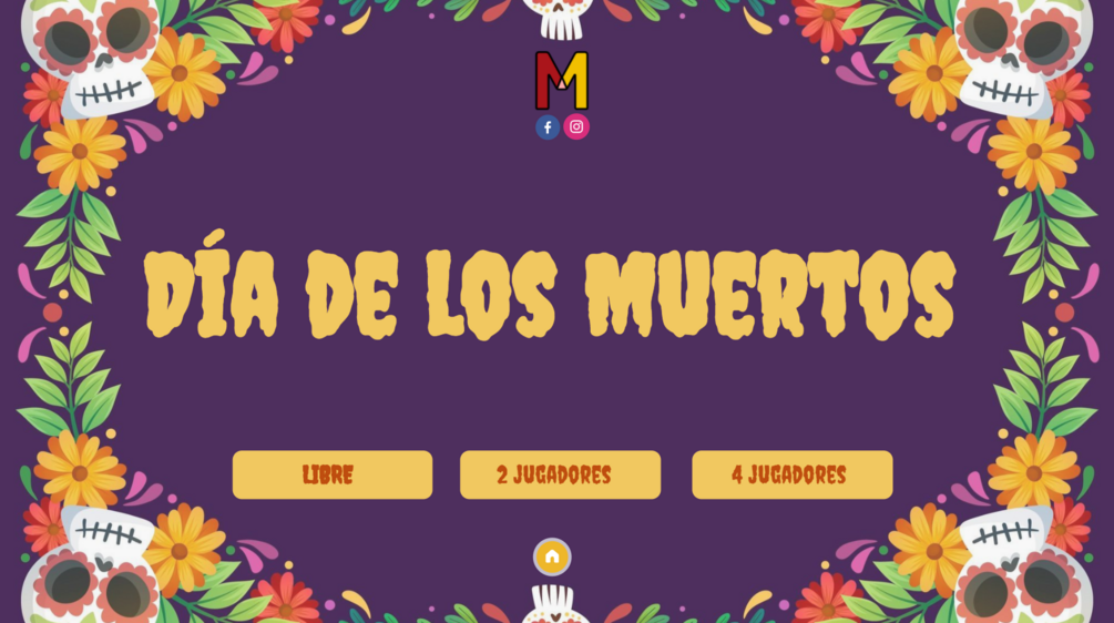 Dominó de Halloween en español, francés y inglés. Día de Muertos en español. Se puede usar en modo libre, dos y cuatro jugadores.